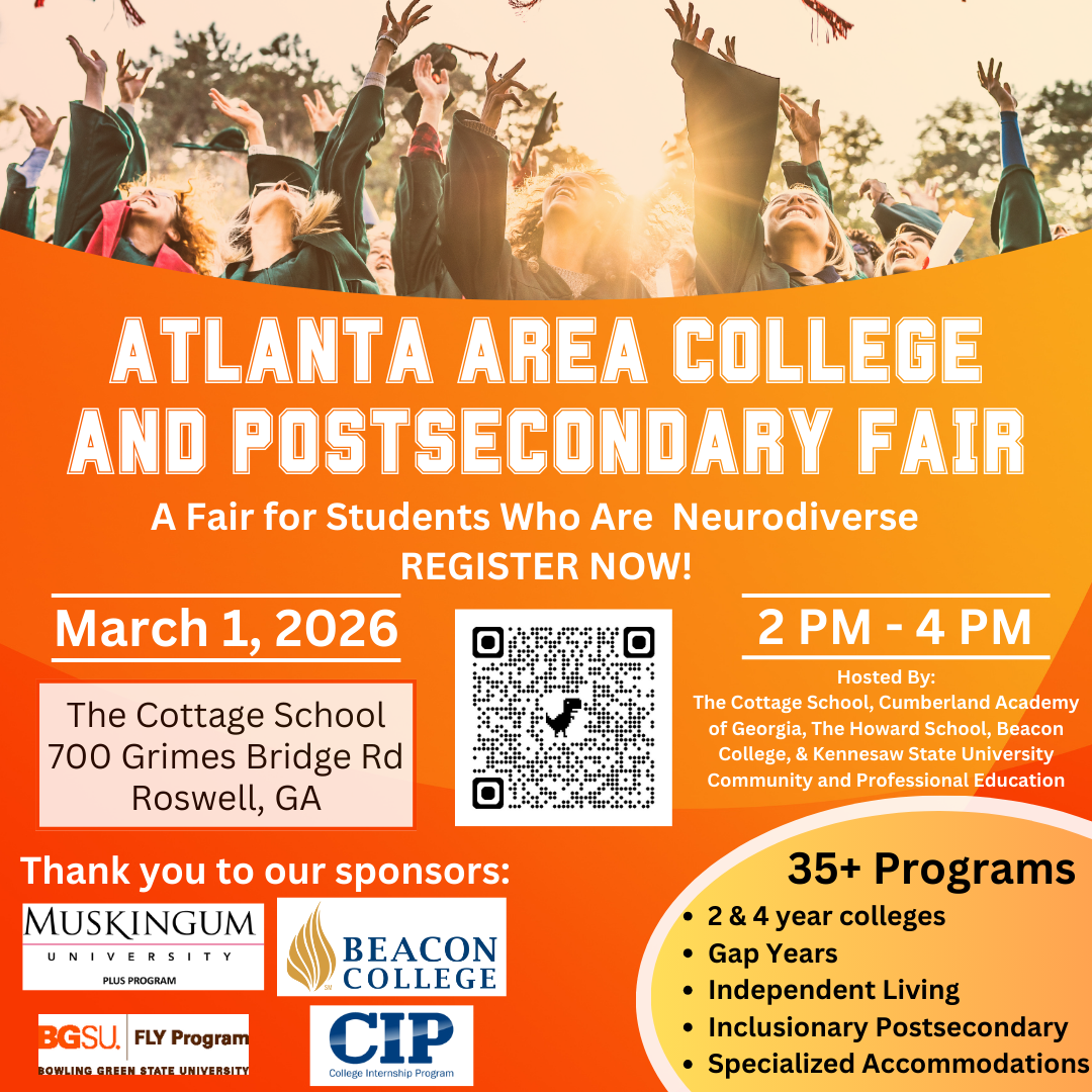 | | Calling All Parents of 8th grade and High School Students Join us for the Atlanta-Area College and Post-Secondary Fair for Neurodiverse Students hosted at The Cottage School on March 1st from 2:00-4:00 pm. What to Expect: - Meet with representatives from colleges and universities.